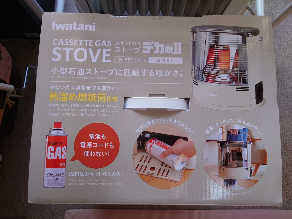 ネットで見るといろいろなメーカーの物が掲載されていますが、ガス器具専業であるイワタニなら安心かと思って、ここの「デカ暖Ⅱ」というものを選びました。カセットボンベ1本で2時間半の連続使用ができるそうですし、常時5~6本のボンベは備蓄してありますから、これで非常時にも安心です。
