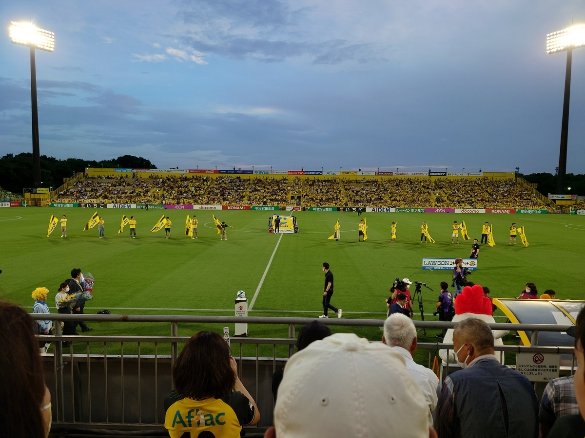この日は雨も予想されていましたのでレインコート持参だったのですが、途中パラパラと降ったくらいで済みましたから助かりました。明るい照明に照らされた緑のピッチはとても美しく、この時期涼しい夜風に当たりながらのナイター観戦は最高です。