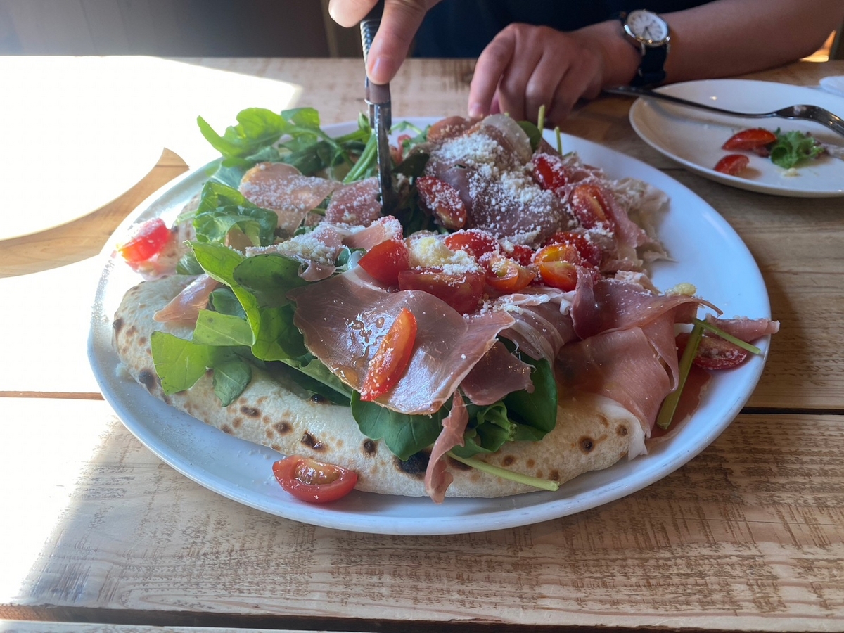その間はカフェでコーヒーを飲みながらのんびり待って、レストランでは、生ハムとルッコラのピザにオリーブトッピング、カルボナーラスパゲッティ、サラダ、クラフトコーラを注文しました。ピザは思ったよりボリュームがあり、これだけでお腹が一杯になりましたが、とても美味しかったです。