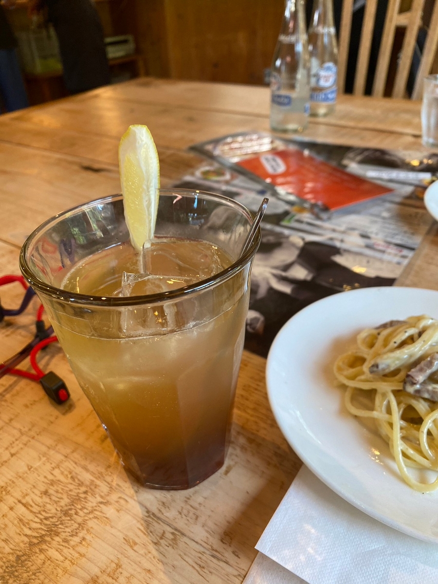 カポナータはそのまま我々が頂くこととして、改めてカルボナーラを発注し一件落着しましたが、このカポナータはグラスでキンキンに冷やした状態で、オクラは冷凍したものをトッピングしてありました。ただナスのカポナータでしたのでナスが苦手な私は一口だけで、後は妻にお任せです。