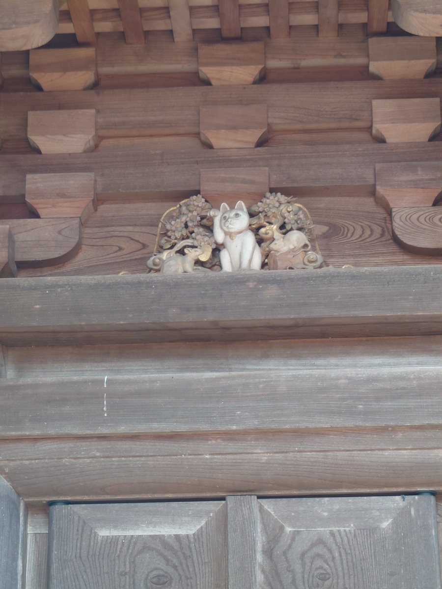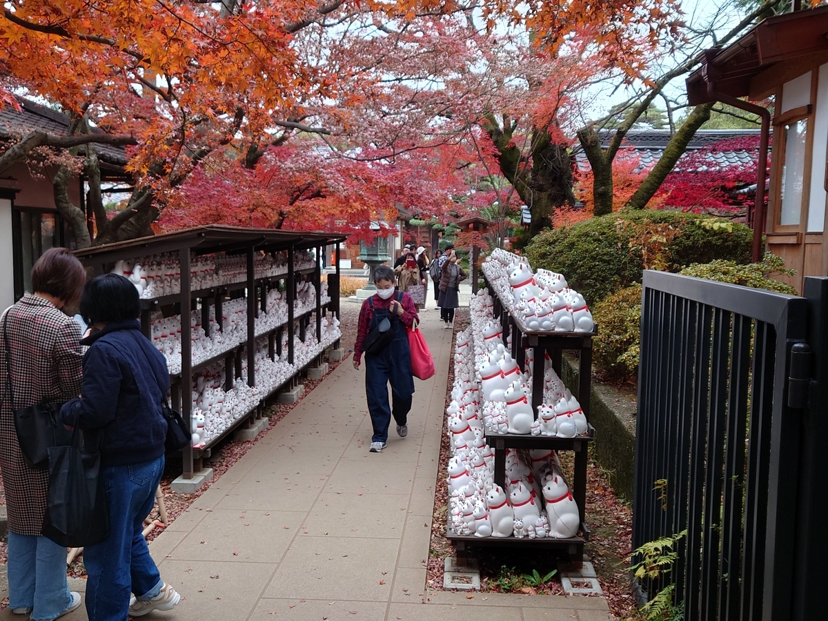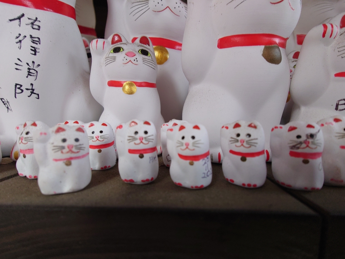 そして私はここで自分の勘違いに気付きました。私はここの招き猫は各地で飾られていた招き猫が何らかの事情で役目を終えて、お雛様と同様にここに奉納されて来ているのだと思っていたのです。ところがここの招き猫はサイズこそ様々ですが、顔・体形・仕草はすべて同じで、このお寺で販売されているもののようです。要は他のお寺の絵馬がこのお寺では招き猫、ということなんですね。
