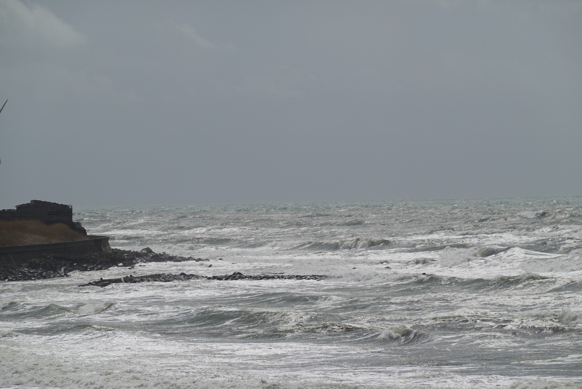 酒田からは日本海沿岸を進むのですが、天候は徐々に回復してきたものの風が強かったですから、日本海は冬を思わせるようなかなり荒々しい波を立てていました。
