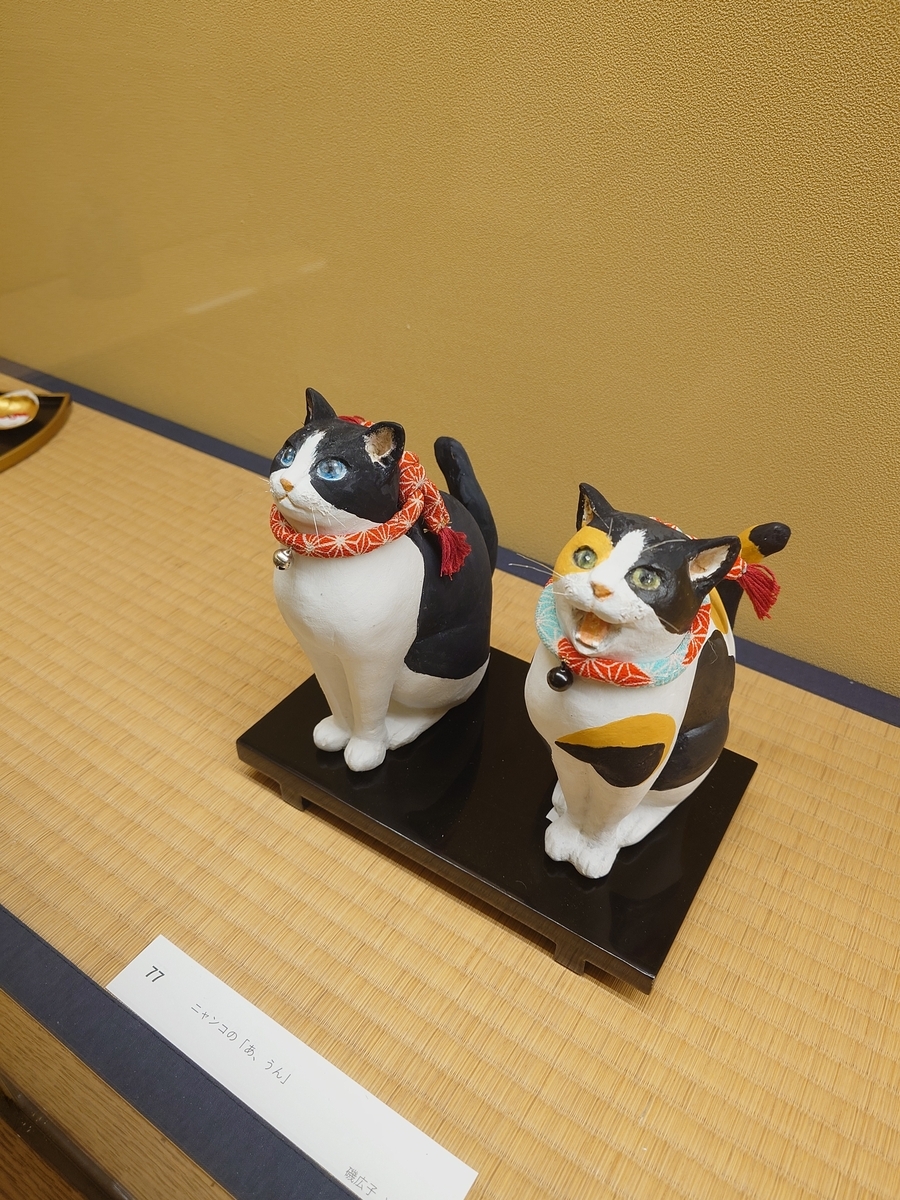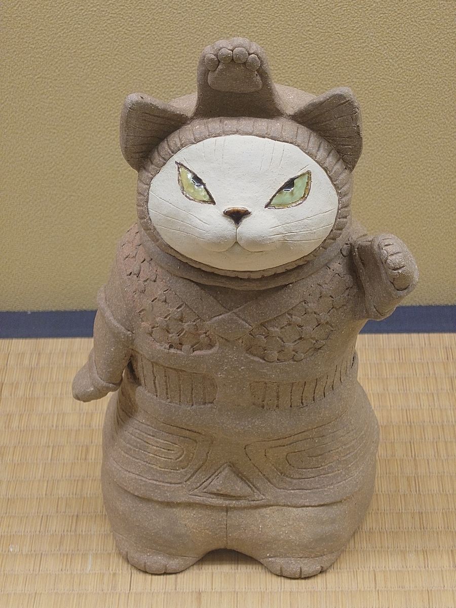 この美術館では毎年「猫ねこ展」というものが開催されていて、今年が第22回なのだそうです。下の最初の写真が今年のグランプリですが、その他にもたくさんの絵画・写真、彫刻・陶芸などの造形作品が展示されていいて、私は3枚目の土偶のような作品のちょっと悪そうな表情が大好きでした。